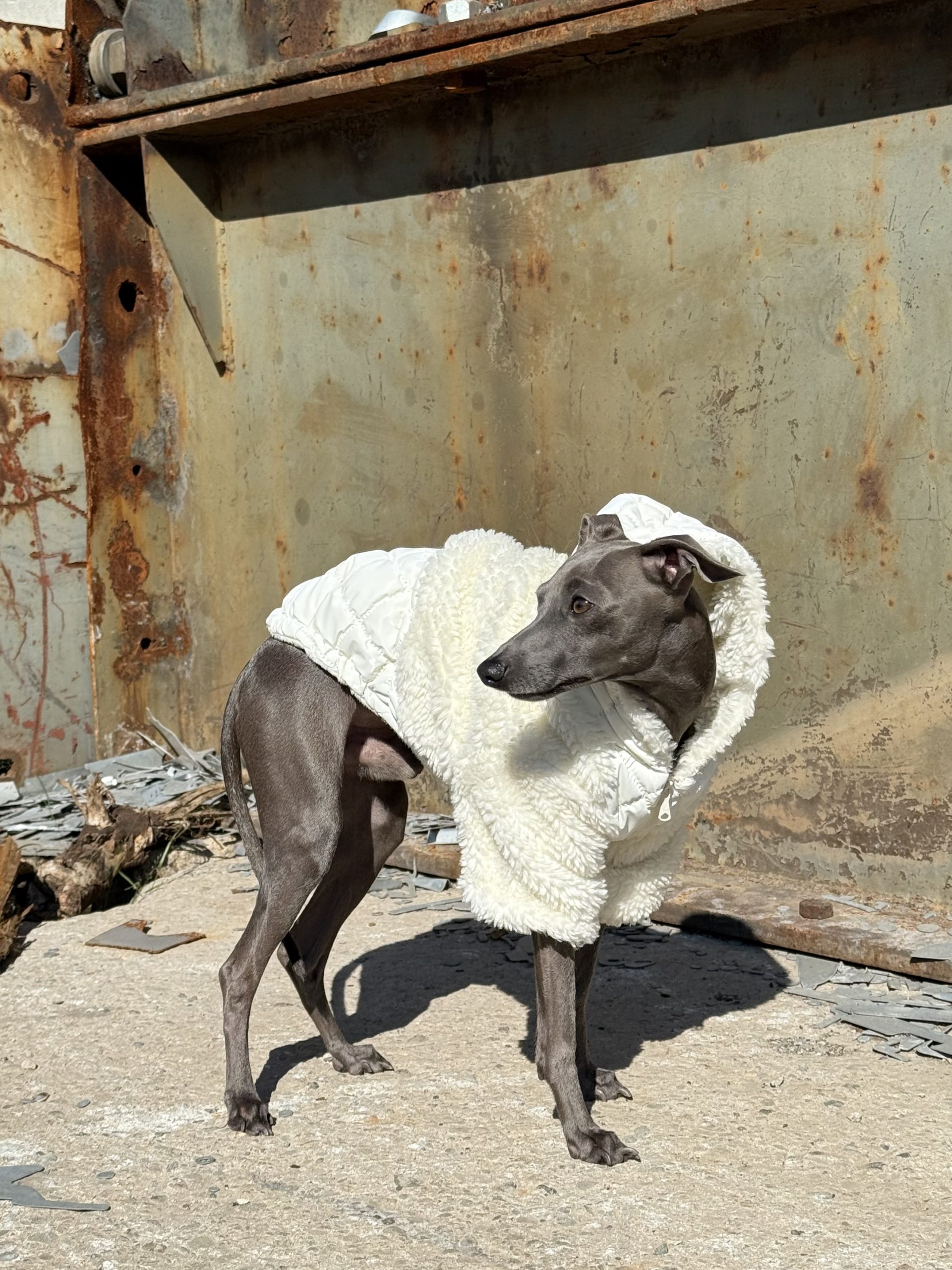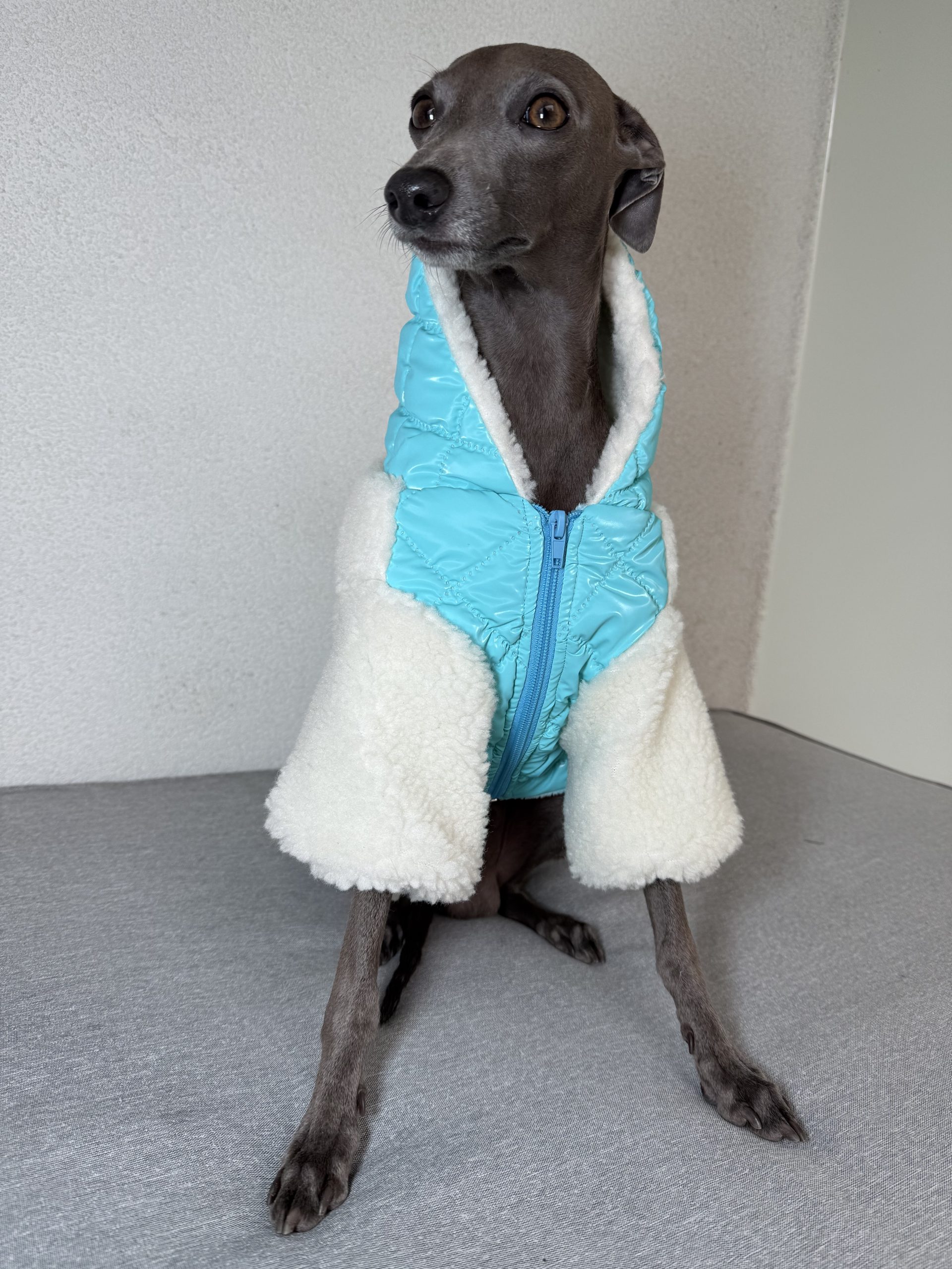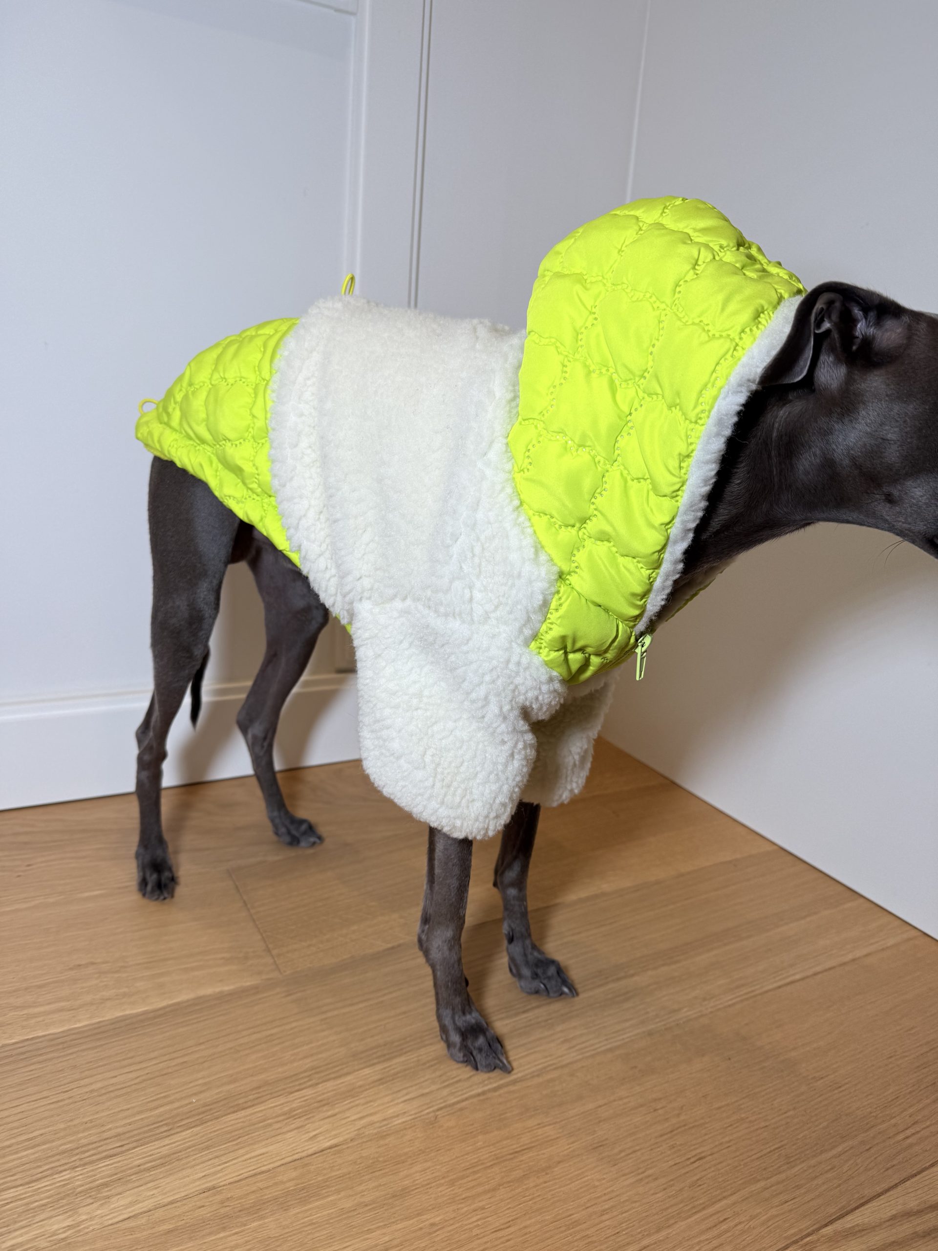 Praktyczne rozwiązania, takie jak otwór na karku do przypięcia smyczy, pozwalają na wygodne spacerowanie bez dodatkowych ograniczeń. Kurtka świetnie sprawdzi się zarówno jako samodzielna warstwa, jak i w połączeniu z kombinezonem dresowym, tworząc stylowy i funkcjonalny zestaw.